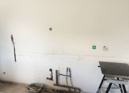 Travaux préparatoires avant pose par un cuisiniste, incluant démontage de l'existant et modification électricité-plomberie.